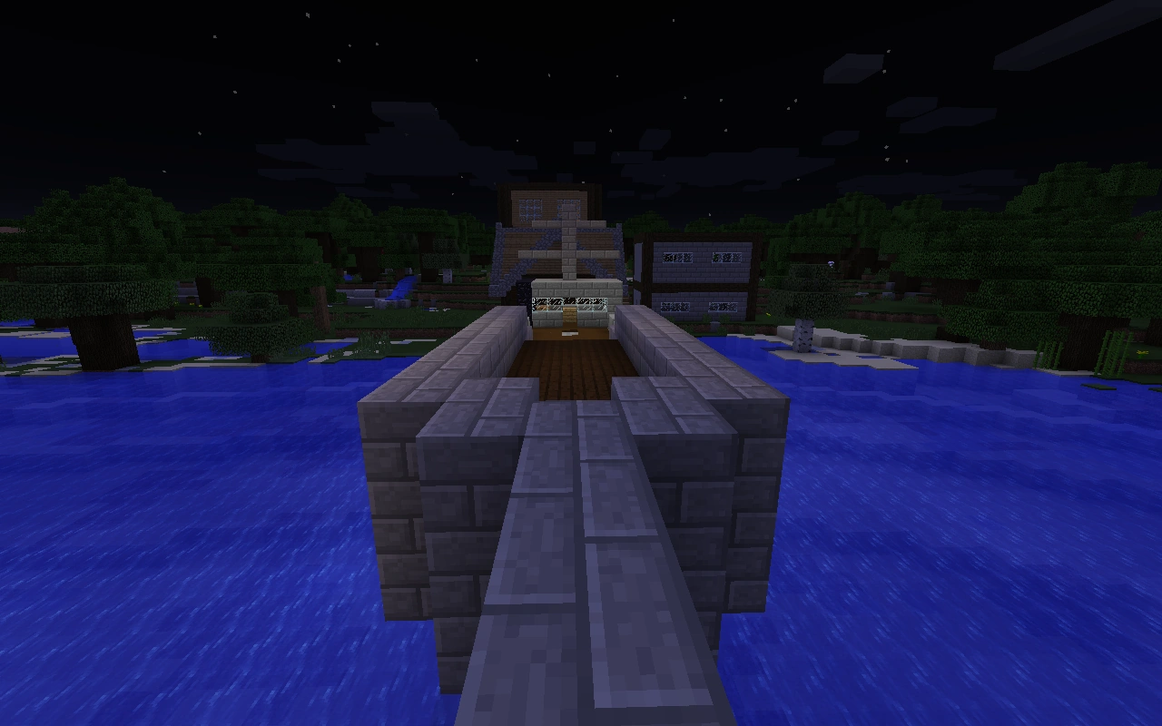 After cruising for some time, we finally came upon Perth. Immediately, I see from the bridge that their cannon is pointed at me. The ship is hit on the left side, only loosing one block. Immedietly, I sail backward and begin loading the main cannon. I fire, however they are still in their town when hit, and it does nothing. I then sail behind some cover and begin reloading. Before they can reload, I fire again, splitting the ship in half, rendering it useless throughout the rest of the battle. Then, I move out a little bit and jump in the water to attack kevlar. The rest of the battle is him attempting to place cobble on my ship, and trying to kill me.